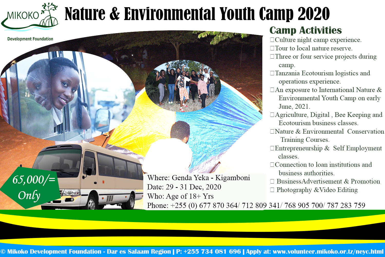- Application Period is from November 10 to December 17th, 2020 at 22:00 hrs GMT. Applications must be received by Mikoko Development Foundation Regional offices on or before December 17th, 2020 at 22:00 hrs GMT. Please submit the application package through email or Call +255 (0) 734 081 696. Please submit the completed application form to the Regional Mikoko Development Foundation - Regional Office Office by December 27th, 2020 at 22:00 hrs GMT.